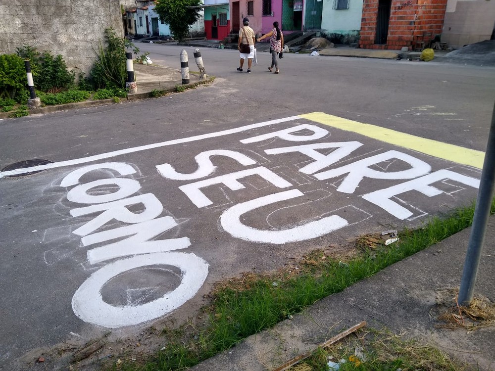 Moradores pintaram uma sinalização irregular com a mensagem "Pare seu corno" em rua no Bairro Dias Macedo, em Fortaleza, para chamar atenção do órgão de trânsito e de motoristas. A frase foi colocada no cruzamento das ruas Ferreira Lima com Amsterdam na noite desta segunda-feira (15). As informações são do G1
